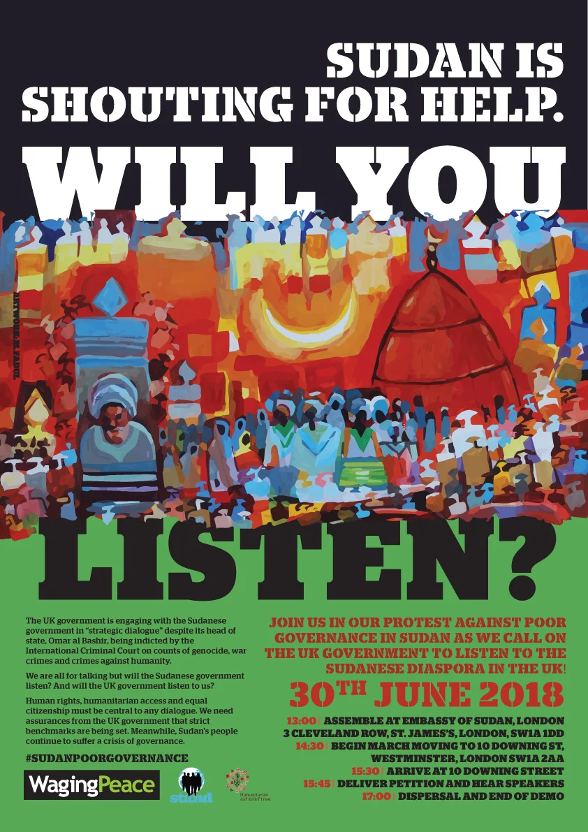 On June 30, 2018, Waging Peace, HART and Sudanese in the UK organized a protest that was replicated in over 100 cities around the world to mark 29 years of poor governance by the Sudan regime. Their letter to Prime Minister Theresa May stated: