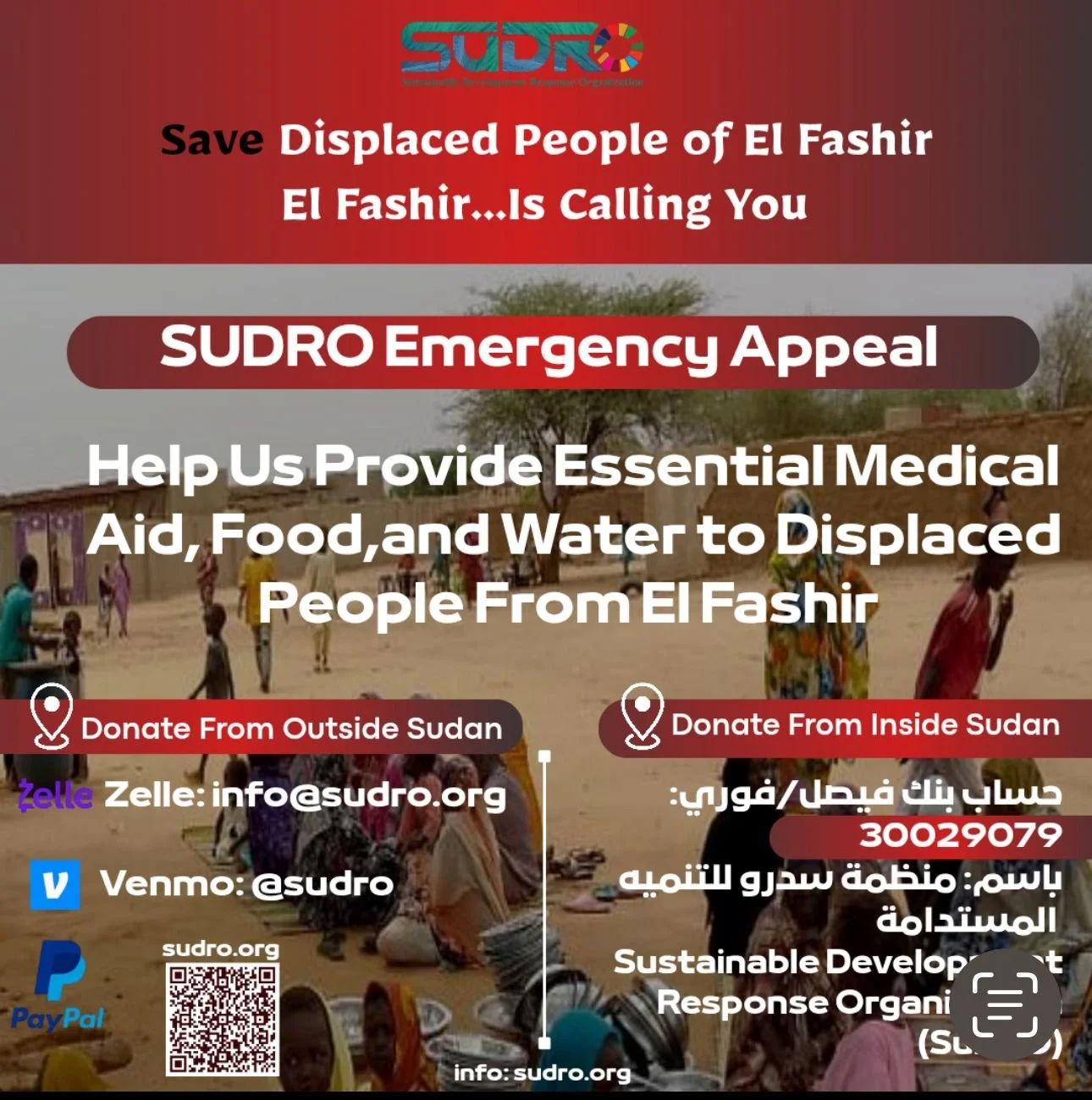 SUDRO is raising funds to provide medical aid, food and water for Sudanese forcibly displaced from El Fasher after violent attacks by the RSF.